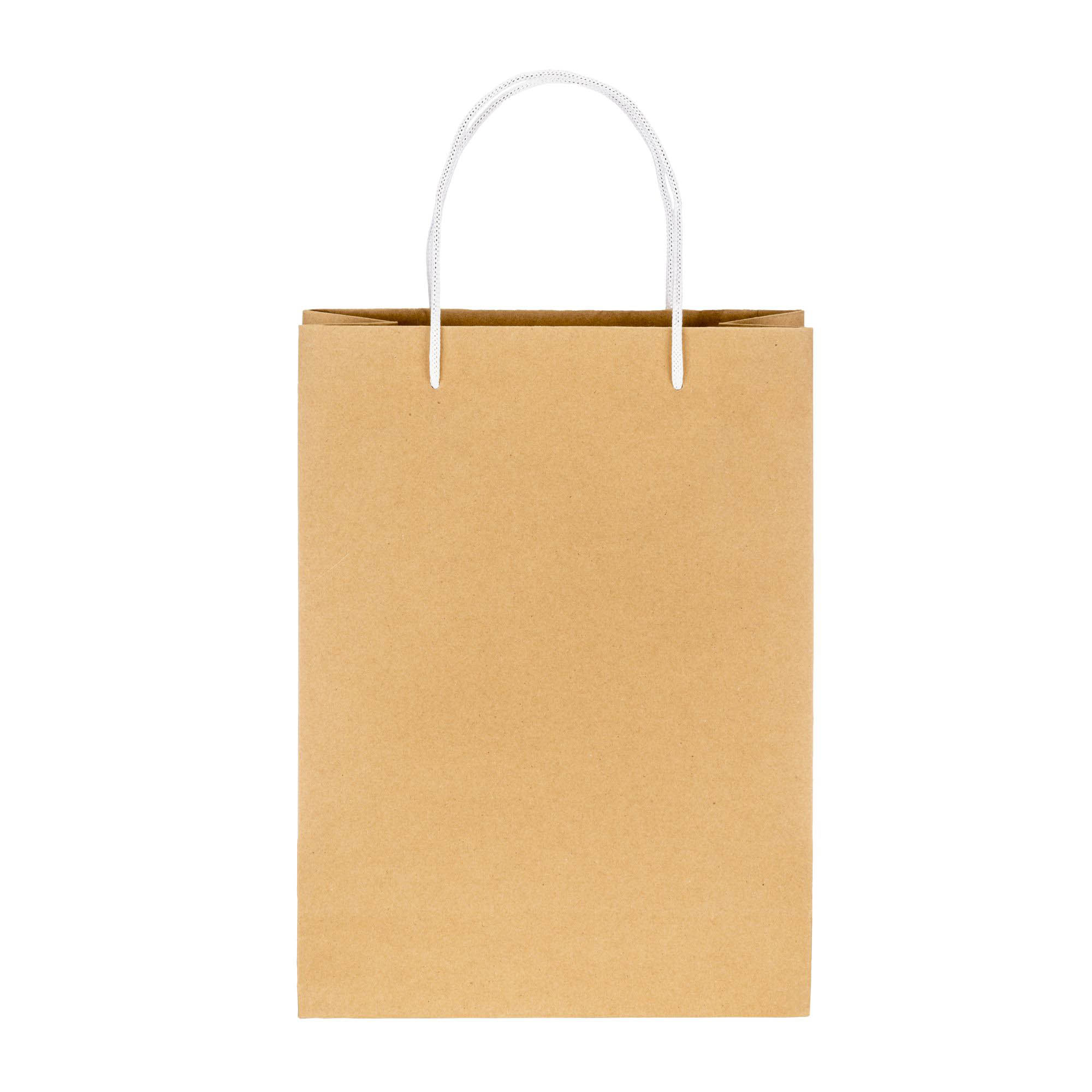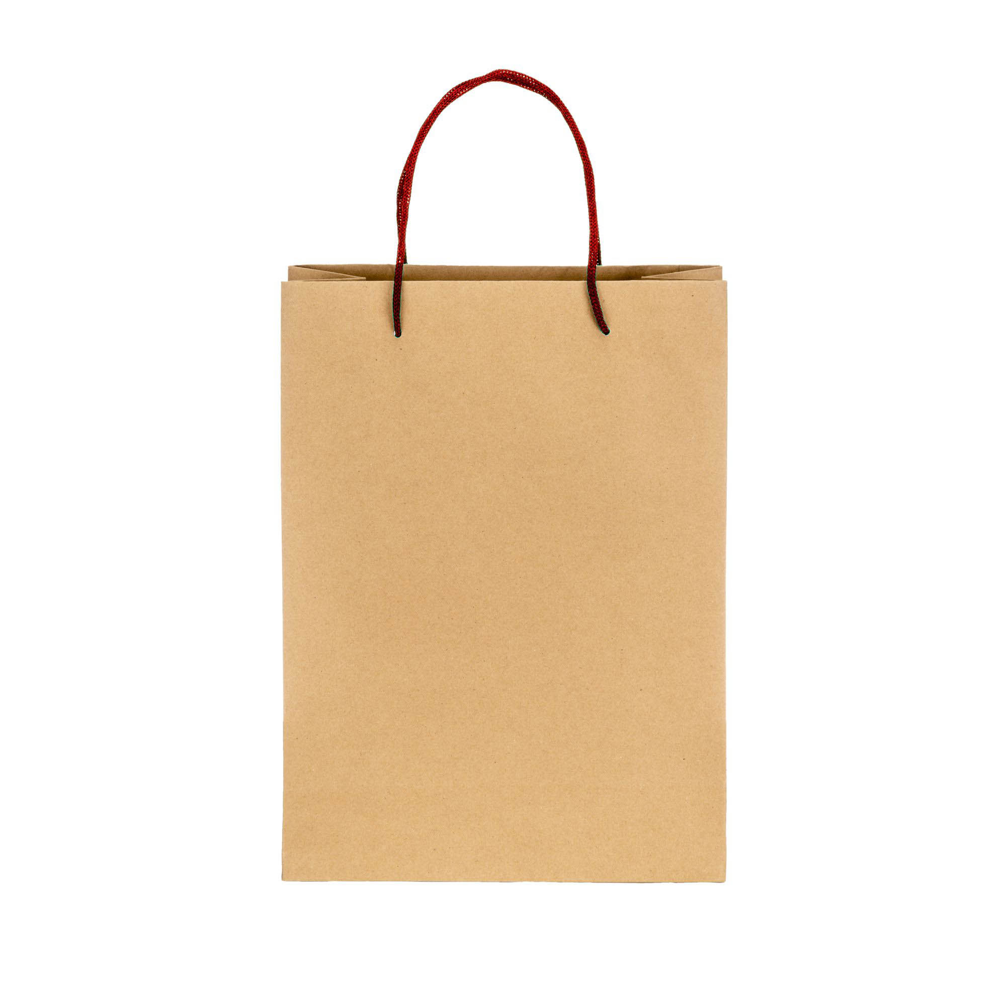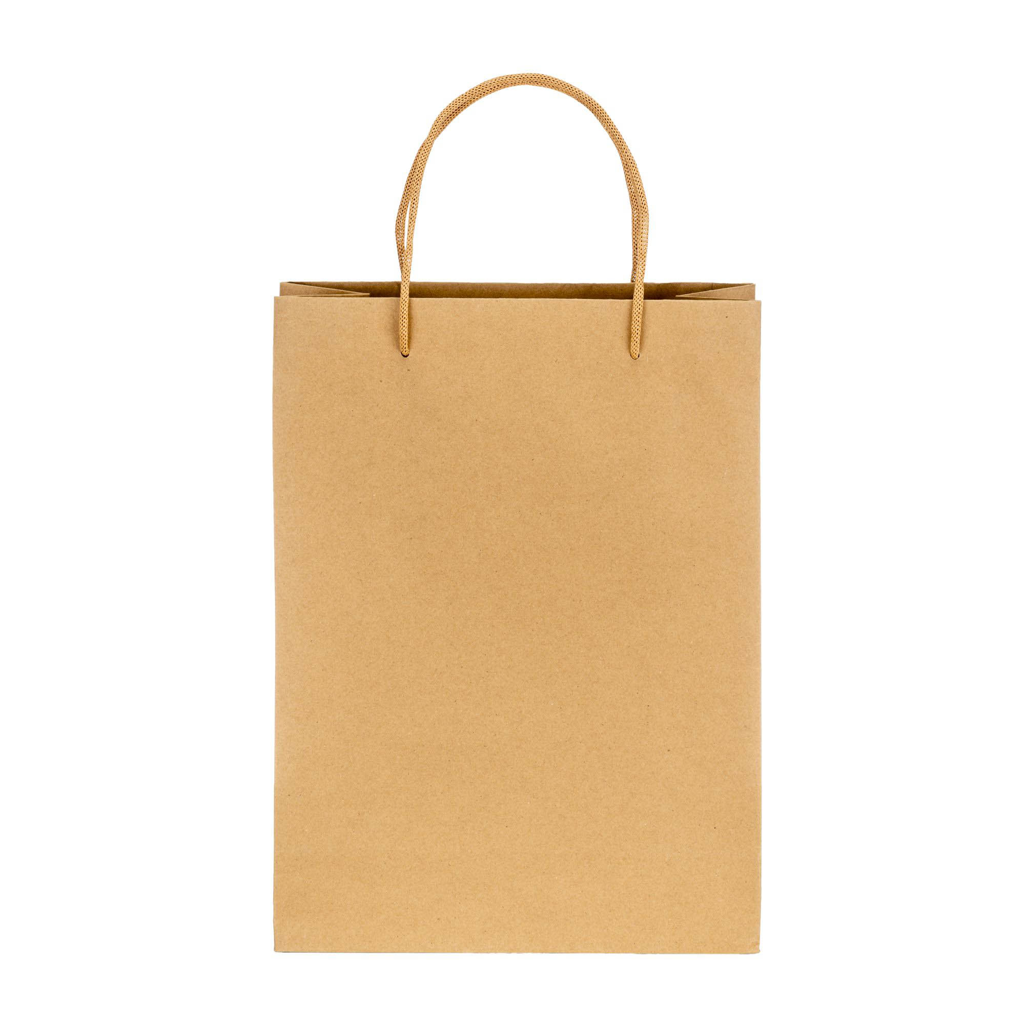 Sacchetto in carta naturale riciclata da 150 g/m2 , 26 x 35 x 11 cm. Dotatato di soffietto e manici corti corti colorati in carta intrecciata.