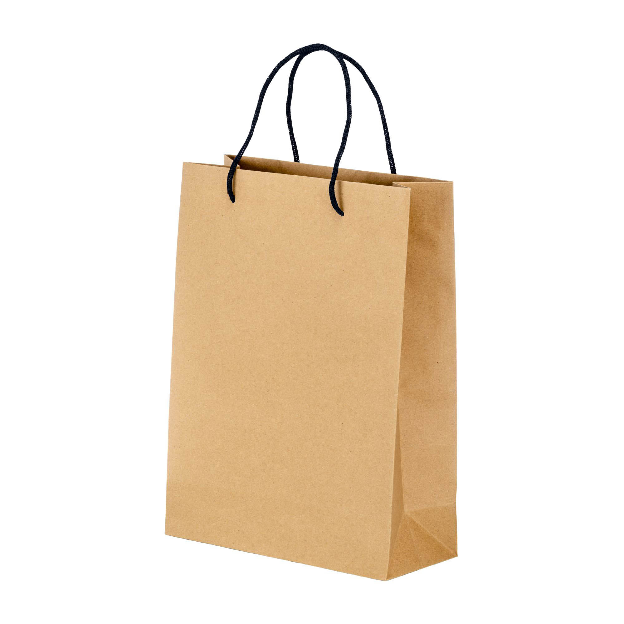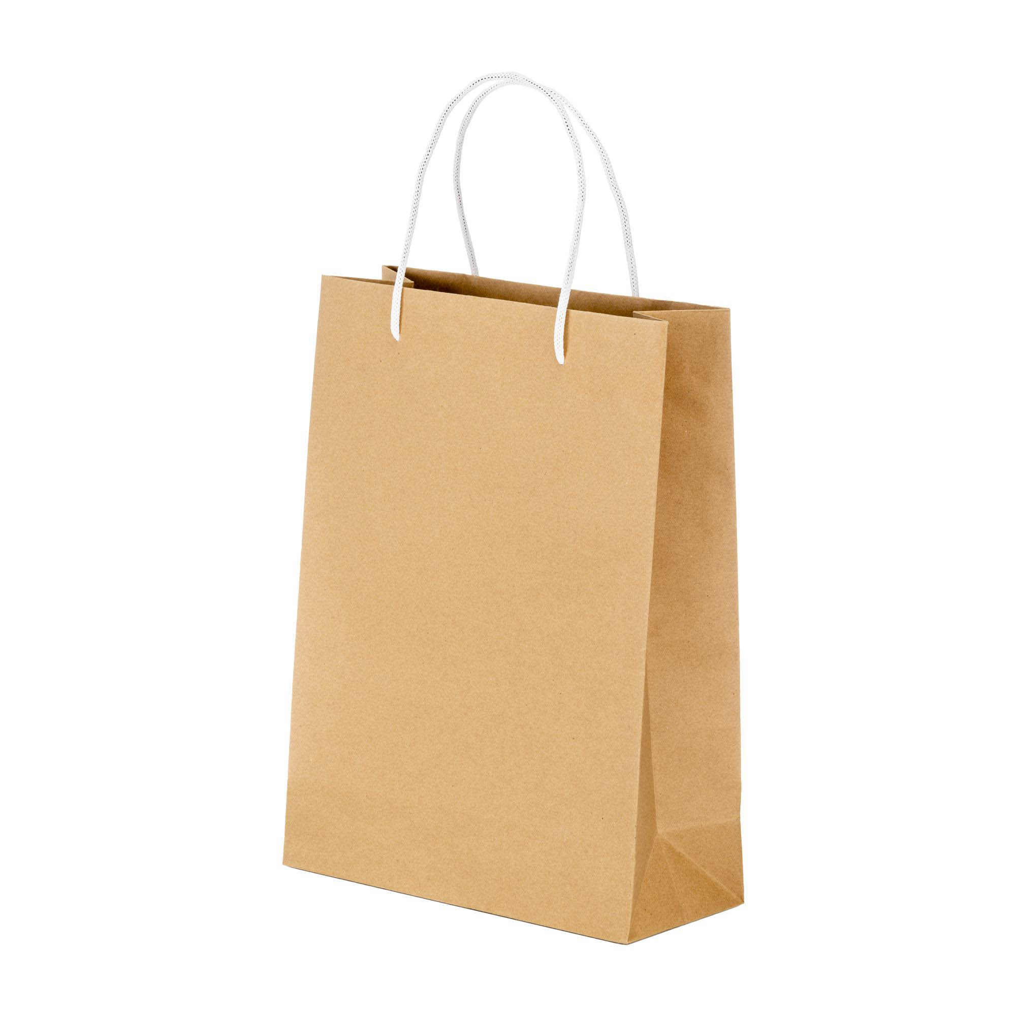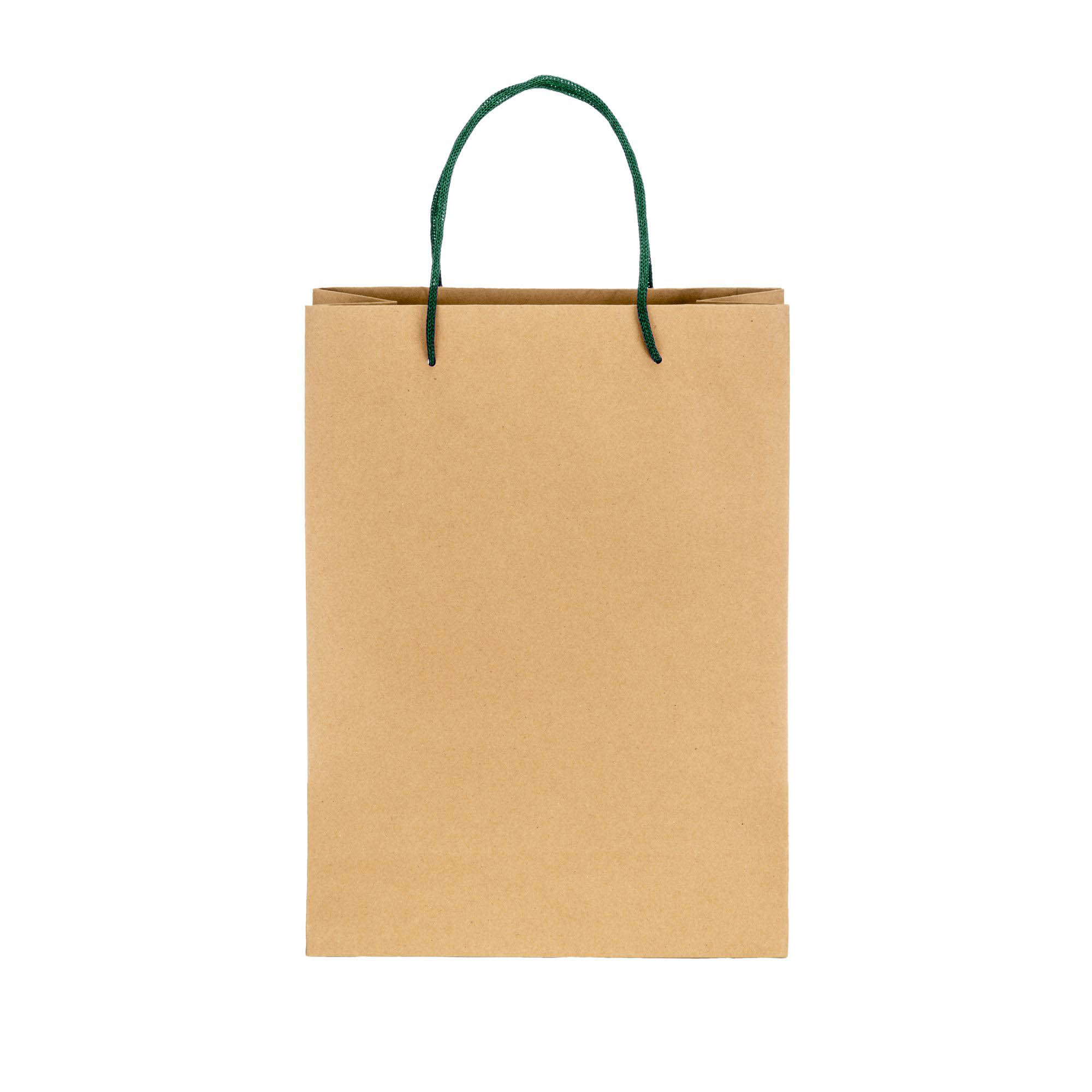Sacchetto in carta naturale riciclata da 150 g/m2 , 26 x 35 x 11 cm. Dotatato di soffietto e manici corti corti colorati in carta intrecciata.