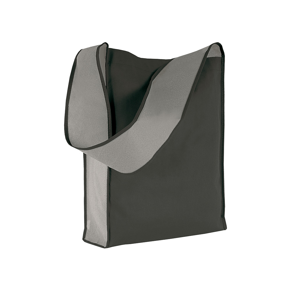 Borsa shopper bicolore in TNT da 80 g/m² cucito. Dotata di tracolla e soffietto.